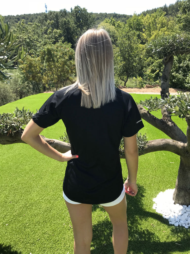 Polo technique-sportif pour femme cintré, à manches courtes à six boutons, manches Raglan, double couture latérale pour une meilleure portabilité, fond profilé et plus long à l’arrière, insert réfléchissant sur les manches, bandage du col en contraste, étiquette transfert.